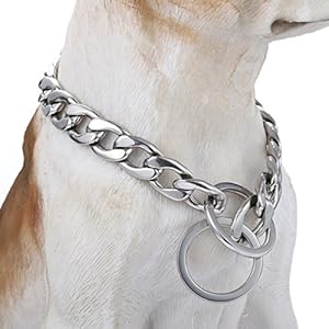 Tips: Drop chain through one of the end loop to make it like a letter PDThe large part of the dog`s head must at least 2.5″ shorter than the collar length, & we advise your pet`s neck is 4″ shorter than the length of the collar!! If not, your dog can not put it one.