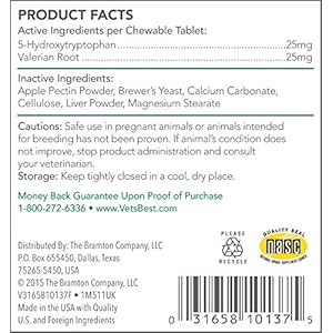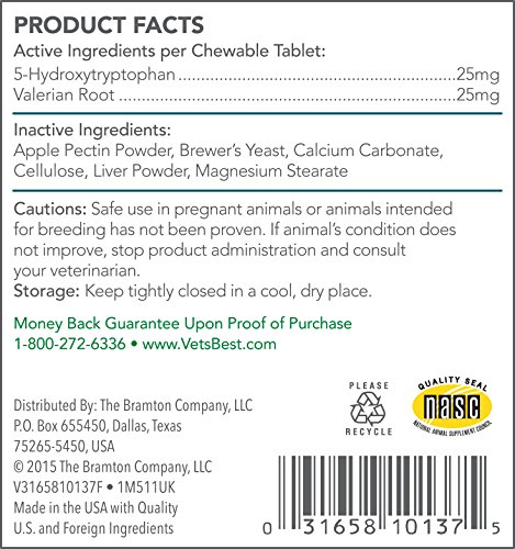 Vet’s Best Comfort Calm supplement for dogs helps ease and reduce anxiety and tension from everyday stresses. Vet’s Best calming aid for dogs use key natural ingredients (tryptophan and valerian root) helps your pet calm and relaxed. Perfect large breed dogs and small breed dogs 10 months and older. Can be given every 6 to 8 hours (use as directed).