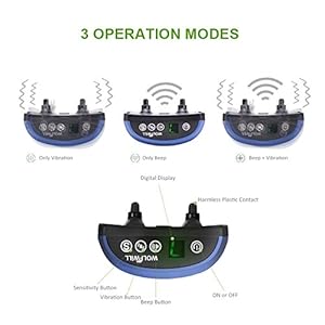 Pain Free Bark Controller – NO SHOCK Collar with 3 modes (Beep/Vibration/Combo), it triggers the built-in sound vibration sensor if dog bark reaches a certain frequency, Friendly and Effectively stop your dog’s overly yapping at neighbor kids, postman and cars passing by