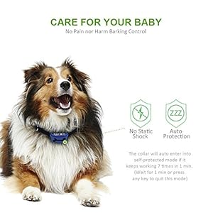 SAFE Auto Protection – Anti-bark collar auto enters into protected mode if it is activated 7 times in 1 min, better protects your dog from endless beep or vibration punishment (wait for 1 min or press any button to quit this mode)