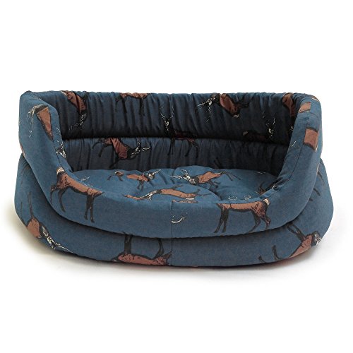 Danish Design Woodland Stag Slumber Beds. An iconic woodland creature printed on midnight blue background, reflecting the colours of the forest night. Made with 100% cotton fabric. Each Slumber Bed has a deep, soft, polyester fibre base easily removable for washing and is quick to dry. Slumber Beds are produced from Fire Retardant Foam providing safety for the pet at home. Fully Machine washable. Category – Slumber Beds.