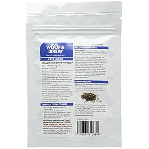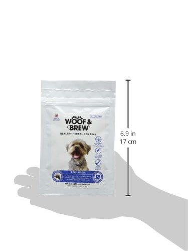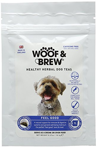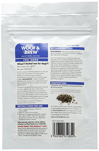 Woof & Brew Healthy Herbal Dog Tea Feel Good 7 Day Pack of Tea Bags Helping support immune & digestive systems, general well-being & providing a natural boost, this is the perfect ‘feel good’ tonic & treat for dogs. Serve as a drink of over food. Caffeine Free. 100% Natural Herbs. Ingredients: Calendula, Dill, Dandelion, Ginseng & Skullcap.