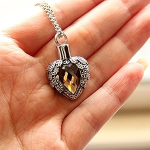 Featuring a stunning champagne topaz gemstone encased with stainless steel heart shaped angel wings, this beautiful necklace will hold your loved one’s memory close to your heart. The pendant contains a small cavity which will safely contain cremation ashes – the urn can be easily filled with the small funnel provided and a toothpick.
