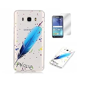 For Samsung Galaxy J510 Case, Samsung Galaxy J5 2016 Case [With Tempered Glass Screen Protector],Fatcatparadise(TM) Anti Scratch Transparent Soft Silicone Cover Case ,Colorful Cute Pattern Ultra Slim Flexible Non-Slip Design TPU Protective [Crystal Clear] Shell Bumper Case Prefect Fit For Samsung Galaxy J510/J5 2016(Feather)